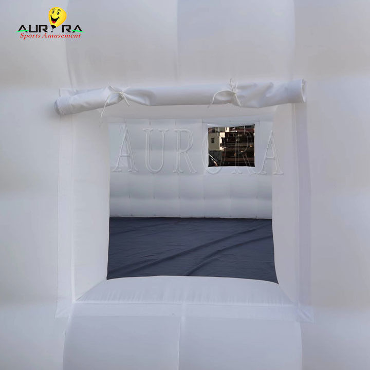 Sobald das Zelt voll aufgeblasen ist, benutzen Sie die fest befestigten Seile oder Bodenstangen, die an das Zelt befestigt sind, um es gegen Wind oder Bewegung zu sichern.